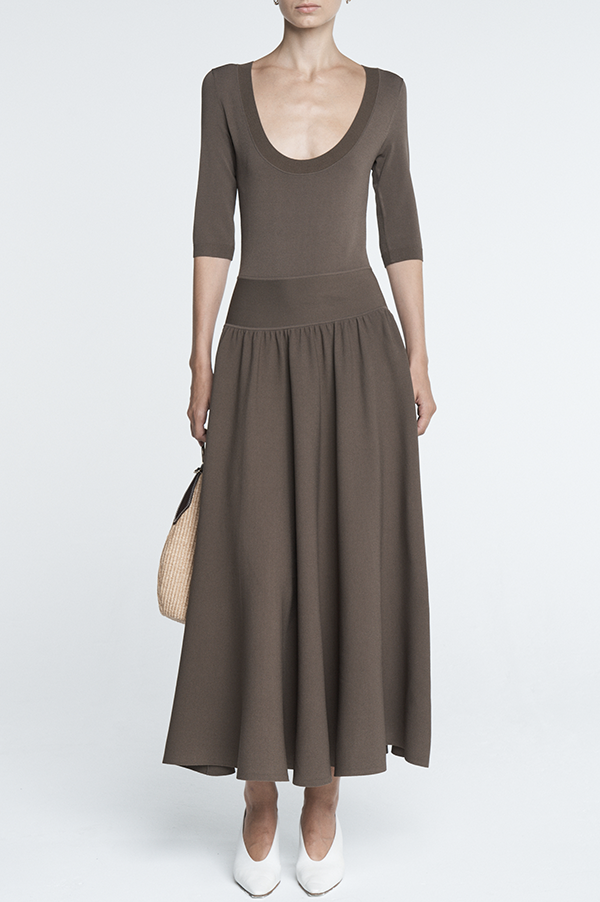 The Double Keyhole Dress in cotton ivory is knit in a FSC stretch viscose, with a form-fitting bodice, scoop neck, elbow length sleeves and a full gathered midi length skirt. The back has a bra-friendly double keyhole detail with large shell buttons.