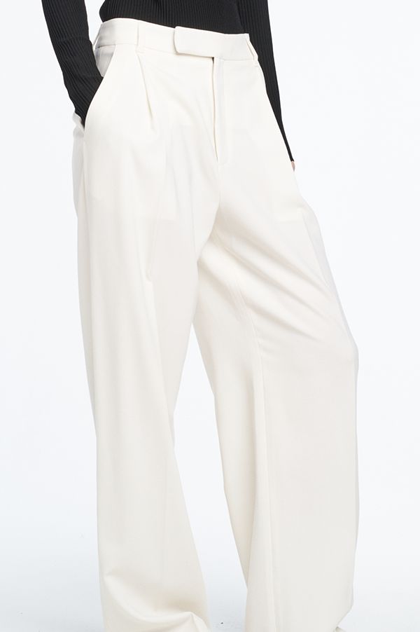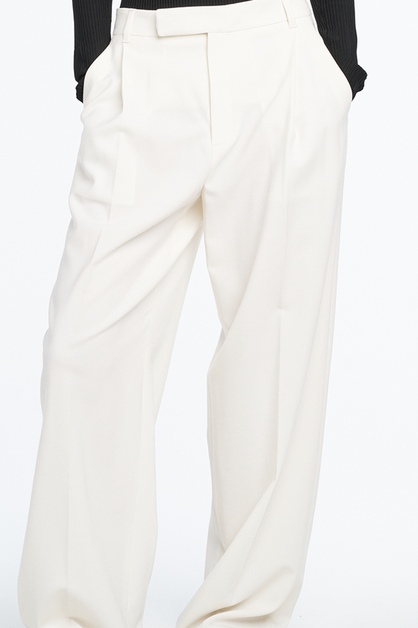 A classic trouser in an ivory lightweight wool basketweave fabrication. Fits mid-rise with a wide leg detailed with a single pleat.