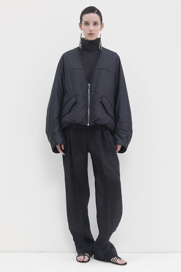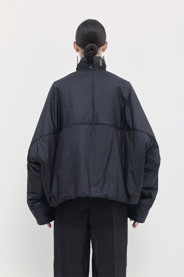 Oversized, long-sleeved puffy v-neck bomber jacket with front welt pock-ets with flaps, adjustable elastic at the hem for snugger fit, and zip front closure.