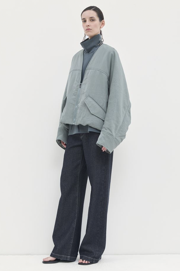 Oversized, long-sleeved puffy v-neck bomber jacket with front welt pock-ets with flaps, adjustable elastic at the hem for snugger fit, and zip front closure.