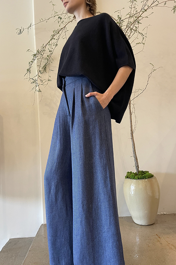 Linen long wide leg pants with high waist, pleats in the front, slits pockets on the sides, and front zip/button closure.