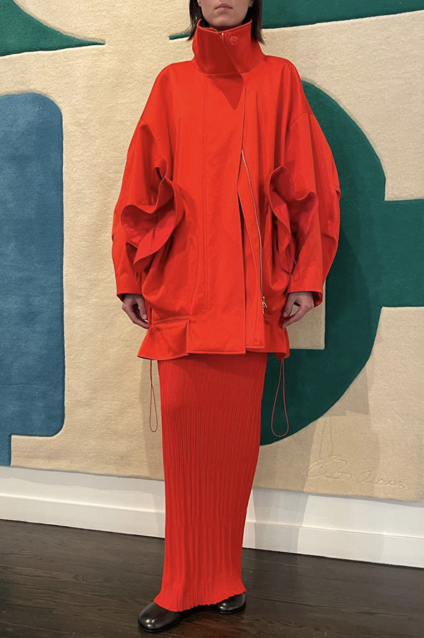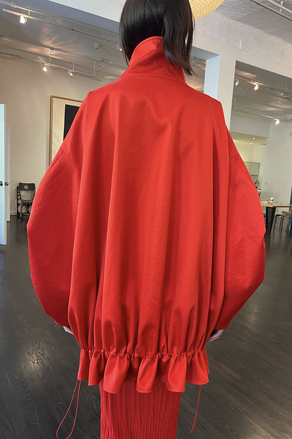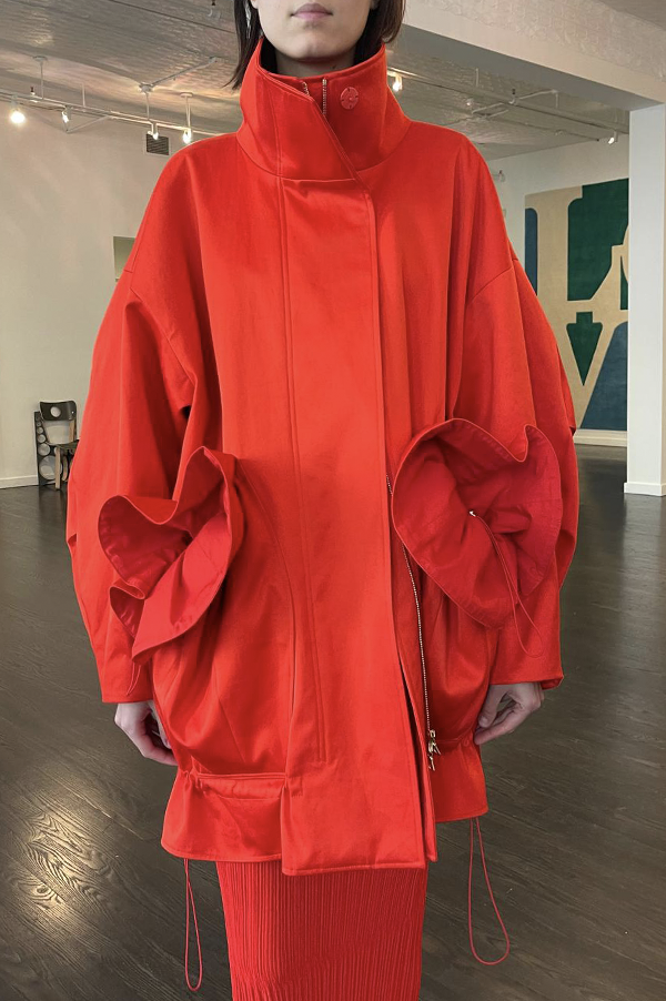 The Chandra “cocoon” coat features a matching peplum hem which creates a drop-waist effect. In an exquisite oversized silhouette, the coat is designed with voluminous side ruffles, funnel neckline and a drawcord hem.