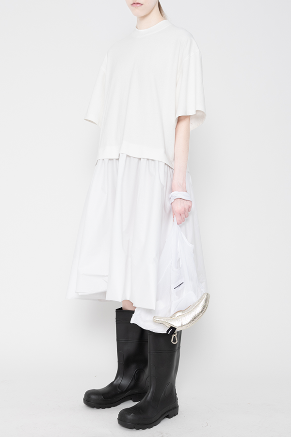 Oversized cotton t-shirt dress features pleated cotton skirt with bubble hem, and slit pockets on the sides. Skirt is lined with mesh fabric.