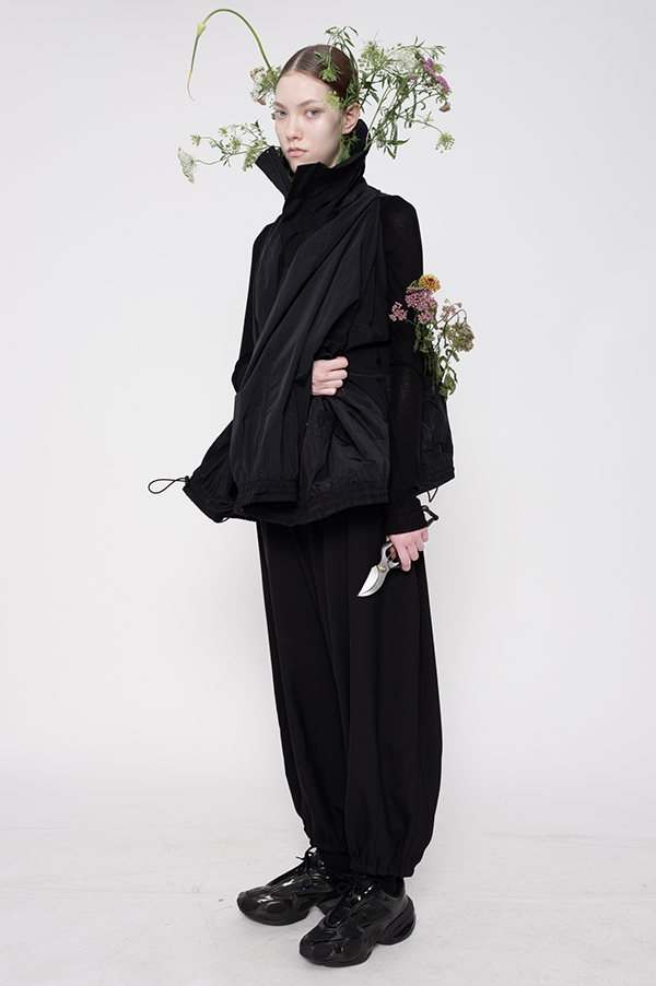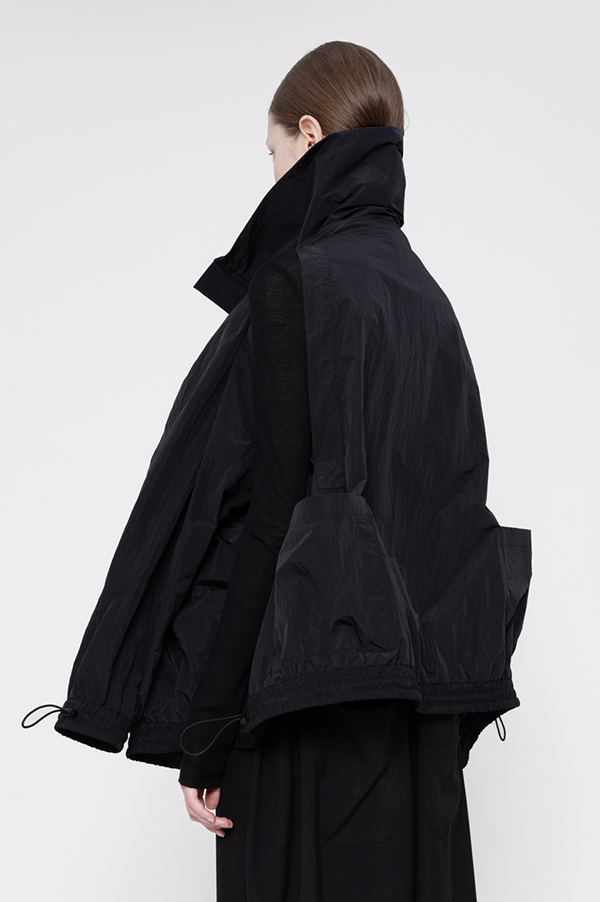 This high collar oversized Windbreaker features water repel wrinkle nylon, slit and zip pockets, adjustable elastic ties at the sleeves, hem and neck, and concealed zip front closure.