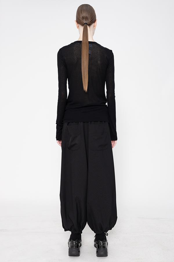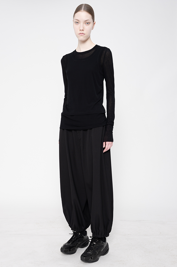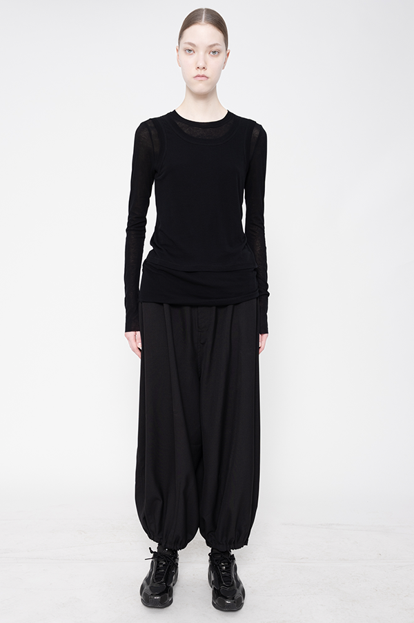 Thin ribbed long sleeve double layer top with crew neckline and raw hem.